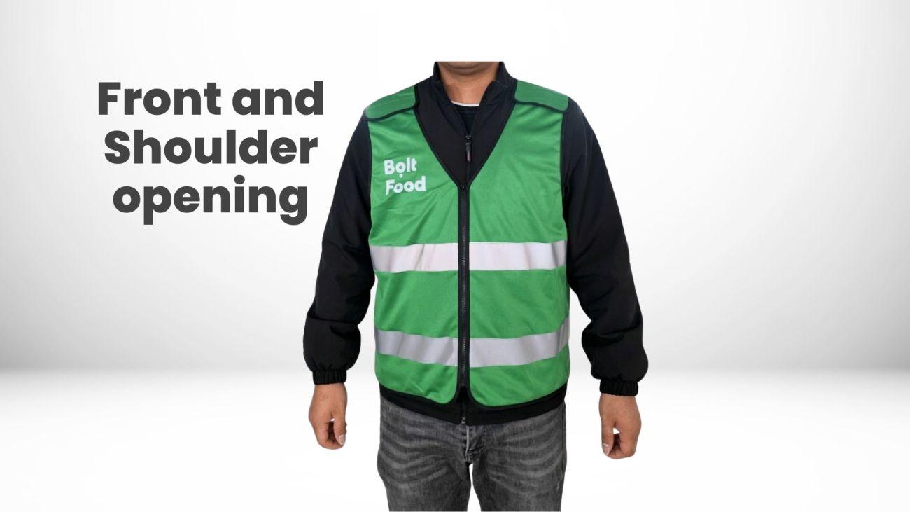 The vest features a full front opening and openable shoulder panels, making it easy to put on or remove—even when wearing a helmet or bulky jacket. This makes it ideal for fast-paced delivery shifts where convenience matters. The bright Bolt Food green color and reflective bands ensure you remain clearly visible in traffic, low light, and poor weather conditions.