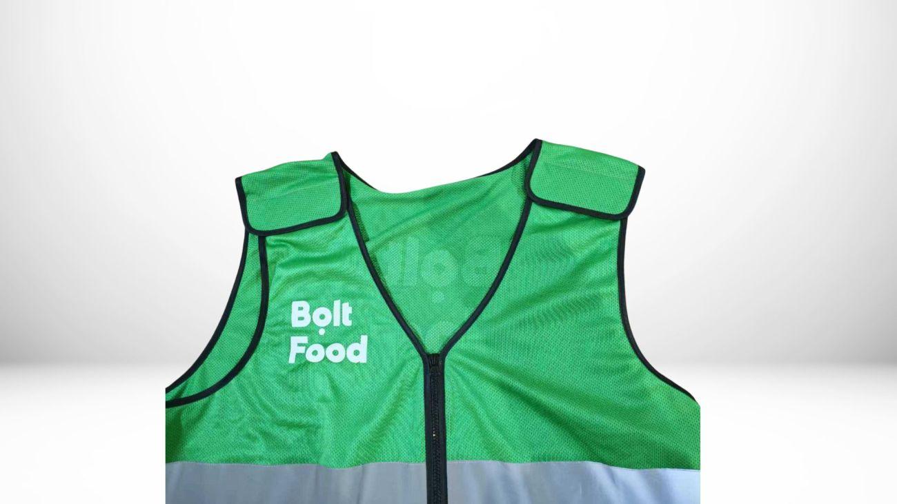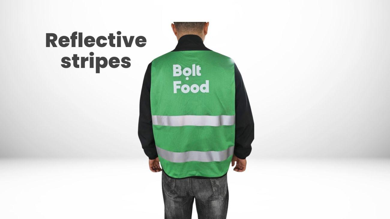 Lightweight, breathable high-visibility mesh vest with reflective stripes, front opening, and openable shoulders for quick wear over any jacket or helmet. Ideal for Bolt Food couriers on the road.